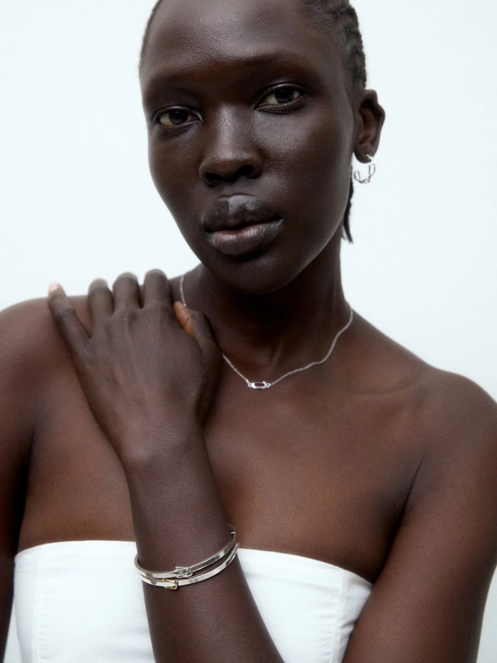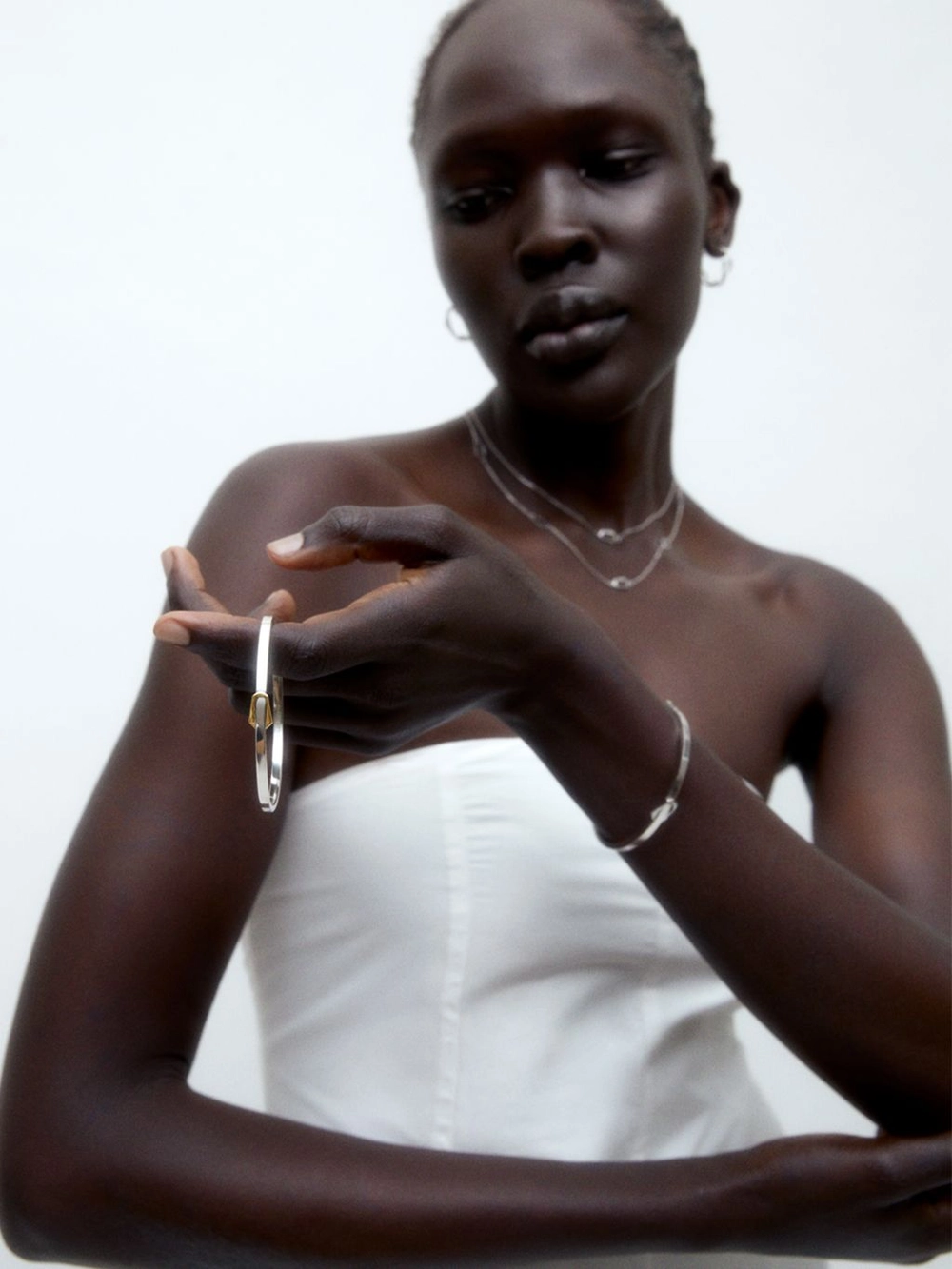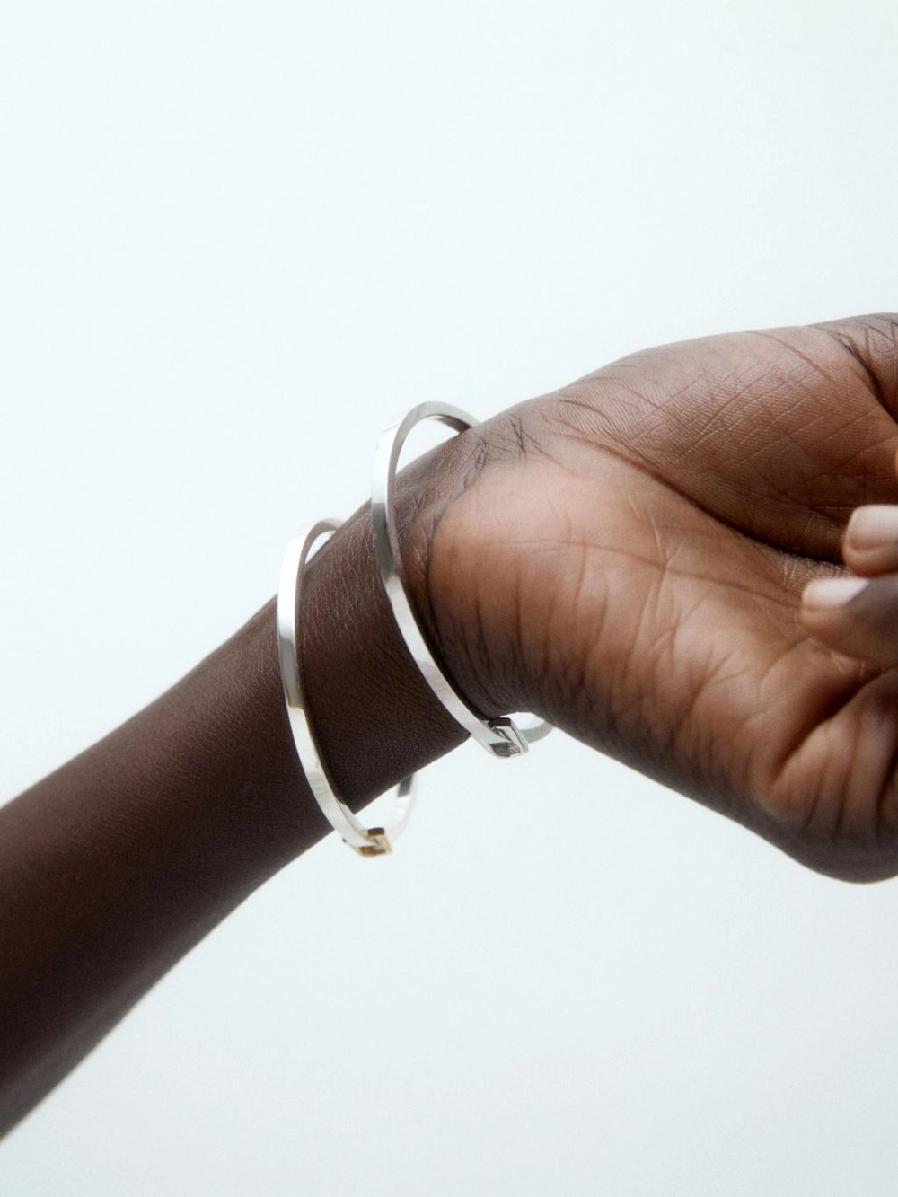 뱅글의 단면이 각지게 떨어져 단독으로 착용하면 심플하면서도 시크한 무드를 연출할 수 있습니다.